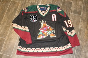 Arizona coyotesподлинная учетная запись @arizonacoyotes. Mix & match this shirt with other items to create an avatar that is unique to you! Customize your avatar with the arizona coyotes kachina jersey #19 and millions of other items. The kachina patterning is now sand and black, with the cuffs and hem being purple, and the shoulders are sand with purple trim as well. Arizona coyotes warmup jersey for throwback diamondbacks night.